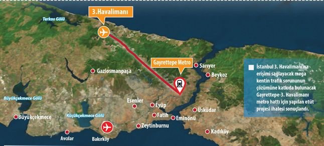 Yıllık 150 milyon yolcu kapasitesiyle dünyanın en çok büyük havalimanı olacak İstanbul’daki 3. Havaalanı ‘na erişim için altyapı çalışmaları sürüyor. Yabancı kuruluşların da kredi için yarıştığı 3. Havaalanı ‘nın metro hattı için etüd proje ihalesi sonuçlandı. Bir sene sürecek proje çalışmaları akabinda projenin yapım ihalesine 2016 senesinde çıkılacak. Projede geline son aşamalara ait veri (bilgi) veren Ulaştırma, Denizcilik ve Haberleşme Bakanı Feridun Bilgin, İstanbul 3. Havaalanı ‘na basit erişimi sağlamak, kentin trafiğine nefes aldırmak için Bakanlık tarafından yapımı üstlenilen metro hattında etüd-proje yapımı ihalesinin sonuçlandığını konuştu .