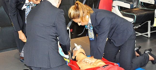 Atatürk Havalimanı Dış Hatlar Terminali’nde oluşturulan simülasyon uçakta, isteyen yolculara nasıl kalp masajı yapılacağı da uygulama anlatıldı.THY Kabin Eğitim Müdürü Yonca Ceylan THY’de görev yapan tüm kabin ekiplerinin Sağlık Bakanlığı tarafından sertifikalandırıldının altını çizerek yaklışk 4 bin kokpit 8 bin 500 kabin ekibinin yolculara uçaklarda karşılaşabilecekleri her türlü sağlık sorunlarına destek vermek için bulunduğunun altını çizdi.