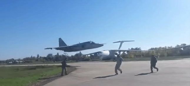Ukrayna’da kaydedilen görüntülerde, 2 Su-25 tipi uçağın alçak irtifadan uçtuğu görülüyor.Öyle ki, uçaklardan biri pisti teğet geçiyor.