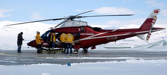 Ağır kış şartlarının hüküm sürdüğü Erzurum’da kar ve tipi nedeniyle yolu kapanan köy ve mezralardaki hastalar ambulans helikopter ve kar üstü aracı snow tracklarla kurtarılıyor.