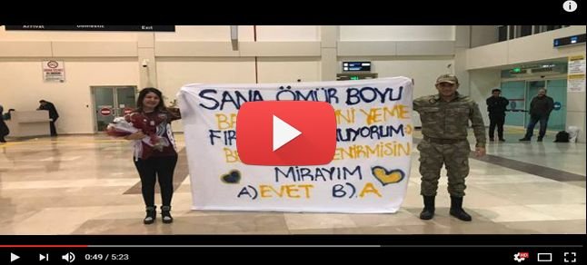 Tezkere dönüşü kız arkadaşı Miray Kaya’ya havalimanında sürpriz evlilik teklifi yapmak için arkadaşlarına pankart hazırlattı.