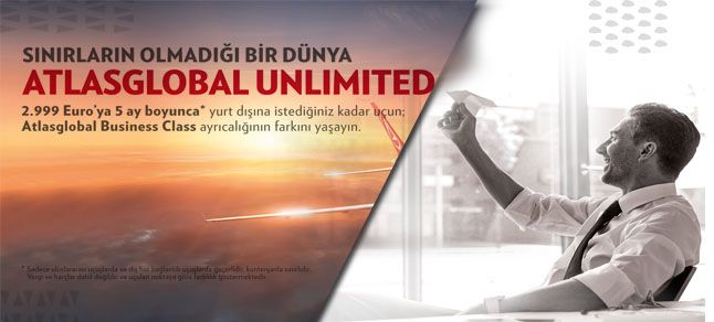 Atlasglobal Havayolları geçen yıl başlattığı ve büyük ilgi gören “Unlimited Kampanyası”na bu yıl da devam ediyor. Paketi “Atlasglobal Havayolları Unlimited Yurt Dışı” olarak güncelleyen Atlasglobal Havayolları, kampanya kapsamında yolcularına; 05 Kasım 2018-31 Mart 2019 tarihleri arasında 5 ay boyunca tarifeli sefer icra edilen tüm yurt dışı destinasyonlarda vergi ve harçlar hariç 2.999 Euro karşılığında istedikleri parkuru seçip istedikleri uçuşu, Business Class konforuyla yapma hakkı tanıyor. Kampanyaya katılmak isteyen yolcuların ise 15 Ekim – 15 Kasım 2018 tarihleri arasında paketi satın almış olmaları gerekiyor.