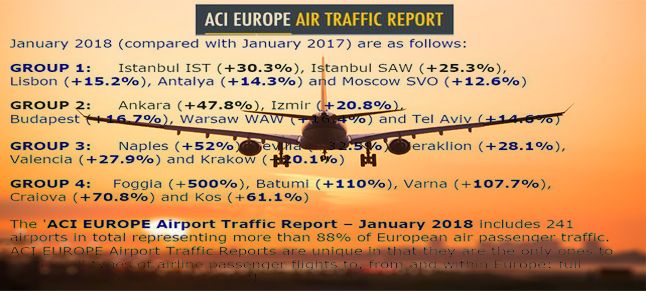 AVRUPA’da 2018 yılı ocak ayı yolcu rakamlarına göre en çok büyüyen havalimanlarına, Türkiye havalimanları damgasını vurdu
