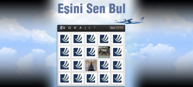 Borajet, resmi Facebook sayfası facebook/Borajet.com üzerinden oynayabileceğiniz yeni oyunu “Eşini Bul” ile hafızasına güvenen tüm ziyaretçilerini kıran kırana bir mücadeleye davet ediyor. ‘Eşini Bul’ oyununda yapmanız gereken tek şey eşleştirmeleri yaparken hızlı olmak!