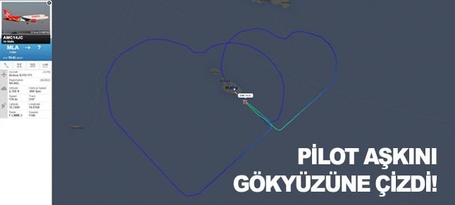 Sevgilisine evlenme teklif etmek isteyen Air Malta pilotu, şirketinden izin alarak A319 tipi yolcu uçağıyla sıra dışı bir uçuş yapmaya karar verdi. Malta’daki Luqa Havalimanı’ndan kalkış yaparak gökyüzünde kalp çizen çılgın pilot, sevgilisine evlenme teklifi etti.