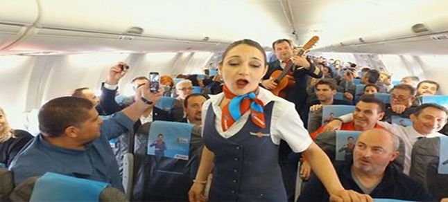 Uçak personeli gibi giyinen çoğu koltuklarda oturan ya da servis elemanı gibi görünen opera sanatçıları bir anda yerlerinden kalkarak çeşitli enstrümanlar çalmaya ve opera şarkıları seslendirmeye başladı. Yolcular büyük bir şaşkınlık yaşarken daha sonra sanatçılara alkışlarla eşlik etti.