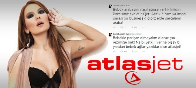 Demet Akalın, Atlasjet Havayolları ile yaptığı son seyahat sırasında bebeği Hira’nın arabasına ait kilidin kırıldığı iddiasıyla şikayetçi oldu. Havayolu şirketi yetkililerine twitter hesabı üzerinde sitemde bulunan Demet Akalın, ‘Bebek arabasını nasıl atıyorsan artık kilidini kırmışsınız sayın atlasjet, insan parası bu, business gidiyoruz şu hale bak’ diyerek tepki gösterdi.