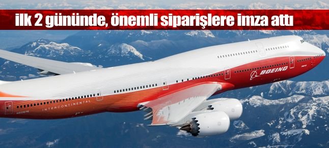 Şirket 8 müşterisiyle, liste fiyatı toplam 18.5 milyar dolara ulaşan, 99 adetlik sipariş anlaşması imzaladı. Boeing, fuarın ilk gününde, iki havayolu şirketinden, efsanevi 747 Jumbo modelinin yeni yolcu versiyonu ve dünyanın en uzun uçağı olan 747-8 Intercontinental için liste fiyatı 5.4 milyar dolar tutan toplam 17 uçaklık sipariş aldı.