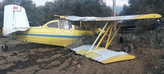 Edinilen bilgiye göre, Edremit’in Dereli Mahallesi Kozyatağı mevkisinde saat 09.40 sıralarında zeytin ilaçlaması yapan uçak, motor arızası nedeniyle önce elektrik tellerine çarpıp ardından da zeytinlik araziye düştü.