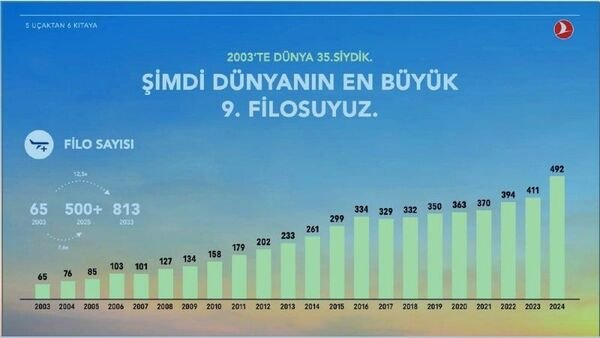 • 2003 yılında THY filosunda yalnızca 65 uçak bulunuyordu ve havayolu dünya çapında 35. sıradaydı.