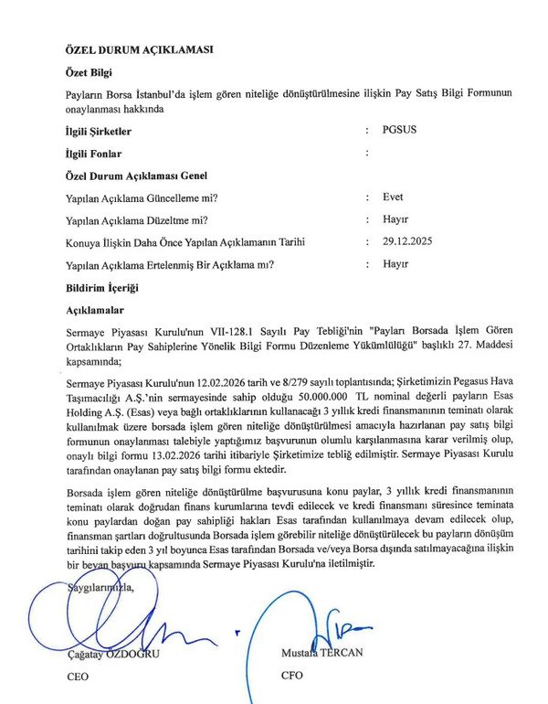 Açıklamaya göre, Sermaye Piyasası Kurulu (SPK), Esas Holding’in Pegasus sermayesindeki 50 milyon TL nominal değerli paylarının “borsada işlem gören niteliğe dönüştürülmesi” amacıyla hazırlanan Pay Satış Bilgi Formu başvurusunu onayladı. Söz konusu onay, SPK’nın 12 Şubat 2026 tarihli ve 8/279 sayılı toplantısında karara bağlandı.