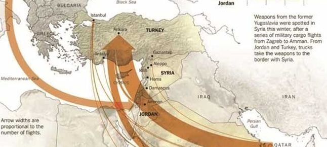 Hava trafiği verilerine göre, son aylarda Esenboğa, Türkiye’deki başka havalimanları ve Ürdün havalimanlarına, Ürdün, Suudi Arabistan ile Katar’dan silah taşıyan en az 160 askeri kargo uçağı indi. Akşam Gazetesi’nin NYT’ye dayandırığı habere göre, 26 Nisan- 4 Mayıs arasında, Katar Hava Kuvvetleri’ne ait, Amerikan yapımı olan devasa büyüklükteki bir C-17 kargo uçağı, Esenboğa’ya altı kez indi. 8 Ağustos’a gelindiğinde, Katar’ın El Udeyd Üssü’nden 14 uçuş daha yapılmıştı. İddiaya göre, Katar Hava Kuvvetleri’nin kargo filosu, sonbaharda gün aşırı uçuş yaptı. Kasımda Esenboğa’ya Ürdün Hava Kuvvetleri’ne ait üç C-130 uçağı indi. Suudi Hava Kuvvetleri de, şubat ortasından mart başına dek Esenboğa’ya en az 30 uçuş yaptı. NYT’ye göre, sevkıyattaki artış, muhaliflerin Suriye ordusunu bazı yerlerden püskürtmesiyle eşzamanlıydı.