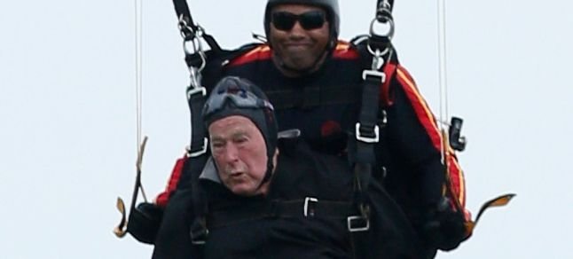 2. Dünya Savaşı’nda genç bir pilotken uçağının ateş alması sonucunda paraşütle atlamak zorunda kalan Bush, 90. yaş günü atlayışında, ”kırmızı, beyaz, mavi”den oluşan Amerikan bayrak renklerindeki bir paraşüt kullandı.