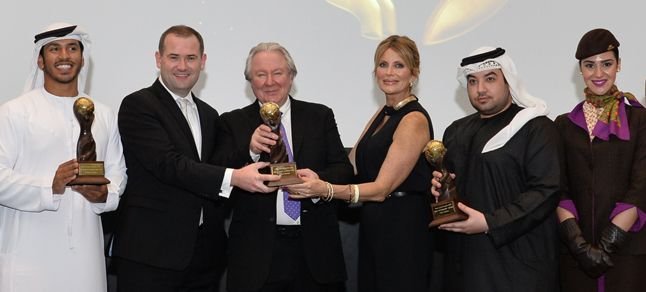 Fotoğraf: Dünya Seyahat Ödülleri Başkanı Graham Cooke (ortada); Etihad Airways’in Misafir Hizmetlerinden Sorumlu Başkan Yardımcısı Linda Celestino (ortada sağda), Misafir Deneyiminden Sorumlu Başkan Yardımcısı Calum Laming (ortada solda), Misafir Deneyimi Ticari Projeler Yöneticisi Turky AlHammadi (sağda) ve Pazarlama Yöneticisi Abdulrahman Al-Hadhrami’ye (solda) ödülleri verirken.