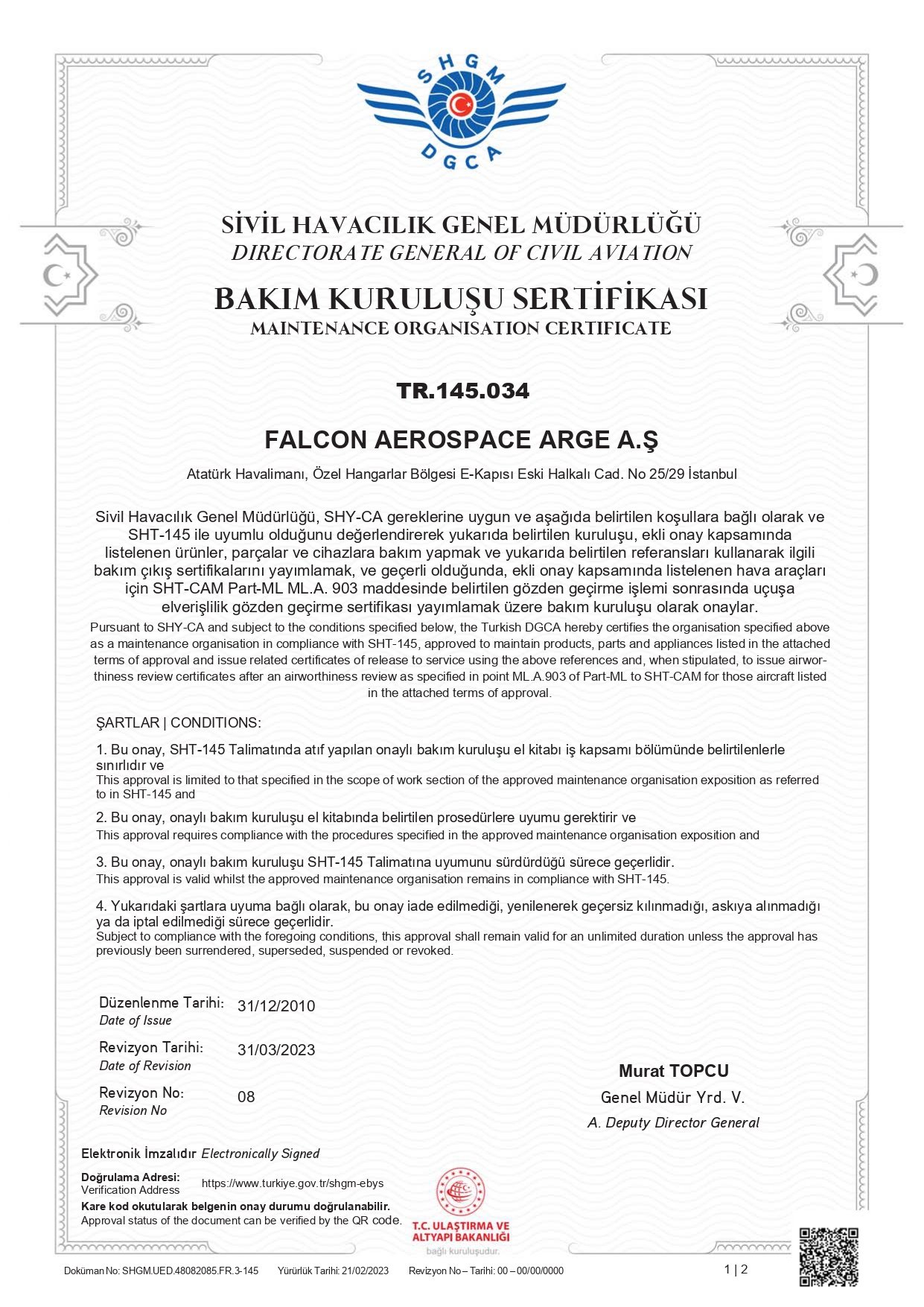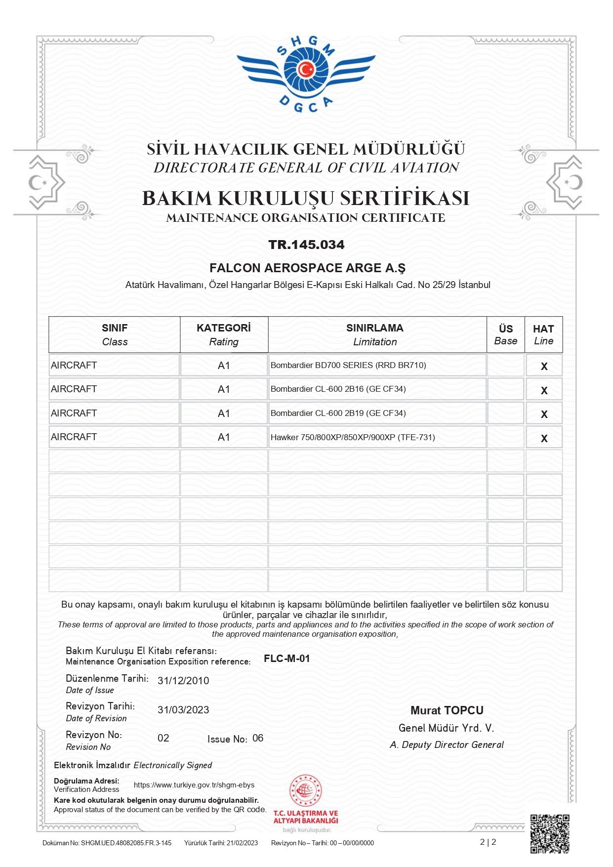 FALCON AEROSPACE Yetkilerini Genişletmeye Devam Ediyor Yerli ve Yabancı iş jeti sahiplerine AOC işletme ve teknik bakım destek hizmeti sunmak üzere 2014 senesinde kurulan Falcon Aerospace Arge A.Ş. (FALCON AEROSPACE) , iş planına uygun olarak 2023’ün ilk çeyreğinde Bombardier Global serisi için almış olduğu mevcut SHGM SHY-145 ve San Marino CAA CAR-145 bakım yetkilerine Bombardier Challenger CL-600-2B16 (CL 604/605/650), CL-600-2B-19 (CL 850) ve Hawker BAe 125 Series 750/800XP/850XP/900XP iş jetlerini de ilave etti.