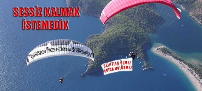 Ölüdeniz’de bulunan dünyaca ünlü atlayış merkezi Babadağ’ın 1900 metrelik pistinden atlayan bir yamaç paraşütü pilotu ve beraberindeki yolcusu, Fethiye semalarından terörü lanetledi. 7 yıldır yamaç paraşütü pilotluğu yapan 27 yaşındaki Gürhan Demir ve yolcusu 24 yaşındaki Özge Kara, atlayıştan kısa süre sonra, ‘Şehitler Ölmez Vatan Bölünmez’ yazılı dev pankart açtı. Demir ve Kara, pankartla Ölüdeniz semalarında dolaştı. Havada yaklaşık 45 dakika kalan Gürhan Demir ve Özge Kara, daha sonra Belcekız Plajı’na indi.