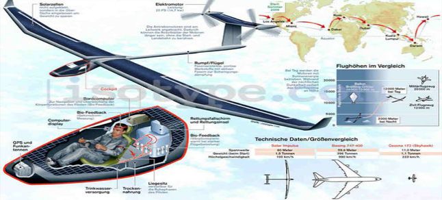 Ağırlığı sadece 2,3 ton olan uçağın 72 metrelik genişliğe sahip kanatlarında toplam 17 bin 248 güneş hücresi bulunuyor. Solar Impulse 2, gündüzleri lityum bataryalarında güneş enerjisi depolayabilmesi sayesinde geceleri de uçabiliyor.