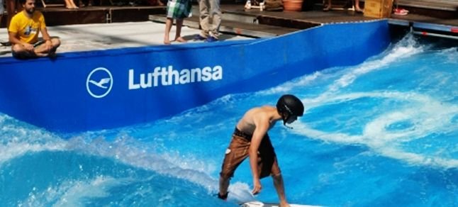 Münih Havalimanı alanına kurulan suni bir havuzda oluşturulan dalgalarda kendine güvenen vatandaşlar dilediğince sörf yapabiliyor.