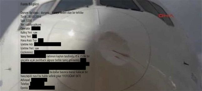 Havalimanlarında çalışanlar arasından SHGM’nin çağrısı üzerine başlatılan ? Gönüllü Raporlama" sisteminin en üst düzeyde değerlendirildiği belirtildi ve gerekli işlemlerin yapıldığı açıklandı. SHGM’nin resmi internet sayfasında yapılan açıklamada ihbarı yapan kişinin kimliği ve uçak şirketinin açık adı karartılarak verilen bilgide, ‘Radom’un kaptan tarafında 15’e 15’lik bir göçükle uçak, pushback (Yardımcı bir araçla geri geri götürülüyor) yapıyor. Belli ki tamir görmemiş. Bu kadar basınca maruz kalacak bir hava taşıtı nasıl bu halde sefere çıkar. Fotoğraf ekte" ifadeleri yer aldı. Ayrıca ‘Gönüllü raporlamalarınız en üst seviyede değerlendirilmektedir. Katkılarınız için teşekkürler" denildi.