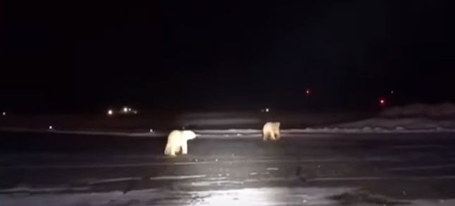 Havalimanı çalışanı olan ABD’li Scott Babcock isimli vatandaşın kayda aldığı görüntülerde, sabaha karşı havalimanında iki tane kutup ayısının olduğunu fark etti.