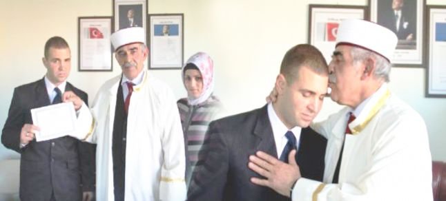 Sarıçam Müftülüğündeki ihtida töreninde Kelime–i Şehadet getirerek Müslüman olan ve ‘Ali’ ismini alan Peter Kern’e Müftü Murat Demir tarafından Kur’an hediye edildi.