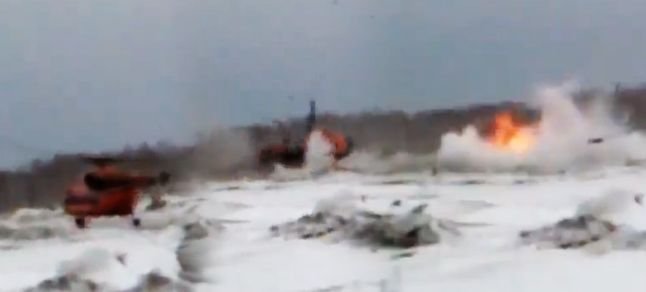 Rusya’da MI 8 tipi helikopter, karla kaplı bir dağlık alana iniş için alçaldı. Pilot, inişi başarıyla gerçekleştiriyordu ki, tam o sırada bir hata yaptı ve helikopterin ayakları yere tam tutunmadan, kuyruğu kayalıklara çarptı.