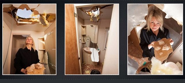 Pattingham’da yaşayan Guy (52), sabah bir "patlama" ile uyandığını ve önce bunun bir hırsızlık vakası olduğunu sandığını söyledi. 2 senedir arsasındaki karavanda yaşayan Guy, banyo bölümünün tavanından girip, eşyaları parçalayarak yeri bile delen kütlenin buz parçaları olduğunu gördü. "Yerde kahverengi ve sarı buz parçaları vardı. 7 saat geçmesine rağmen buzlar erimedi" diyen Guy, bu parçaları delil olarak derin dondurucusunda saklıyor. 2 çocuk annesi Guy, "Buz kütlelerinin benim de çocuklarımın da üzerine düşmemesi büyük şans. Birine isabet etse öldürebilirdi" diye konuştu.