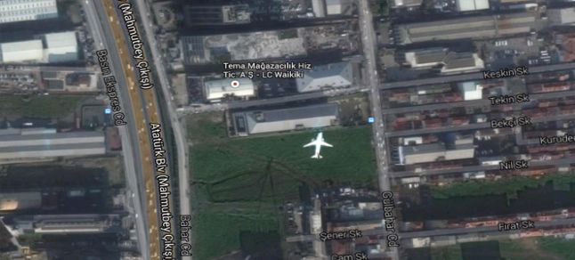 Google Maps üzerinden İstanbul’u gezen kullanıcılar Atatürk Havalimanı’na geldiğinde park etmiş vaziyette onlar uçak göze çarpıyor. Bunun biraz yukarısında olan Basın Ekspress yolunda ise boş bir arsa üzerinde sanki pisteki uçaklar gibi park etmiş gibi başka bir uçak beliriyor.