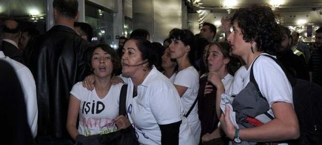 Evrensel‘in haberine göre terminalde “Katil IŞİD, işbirlikçi AKP” yazılı önlükler giyen ve “Jin jiyan azadi”, “Kobanê halkı yalnız değildir” sloganları atan kadınlara polis saldırdı.