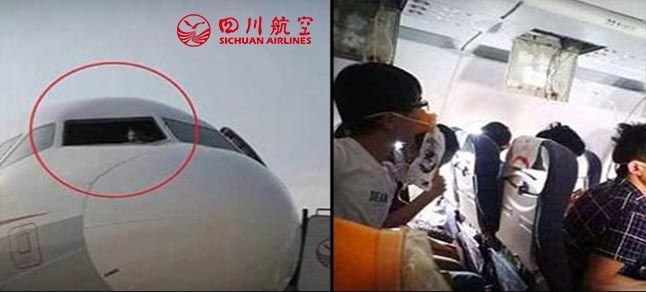 Sichuan Airlines’a ait Airbus A319 uçağında, uçuşunun 30. dakikasında 10 kilometre yüksekteyken ön cam patladı. Çin’in Çongçing bölgesinden Tibet’e gitmek üzere havalanan uçakta kokpitin ön camı patlayınca büyük panik yaşandı.