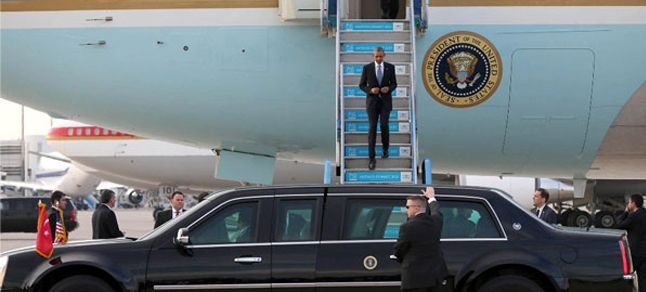 Apronda kendisi için bekleyen, önünde Türk ve ABD bayrağı bulunan aynı plakalı iki limuzinden birine binen Başkan Obama, konvoy eşliğinde alandan ayrıldı. Obama’nın bindiği zırhlı makam aracını bir erkek sürücü kullanırken, aynı marka ve plakalı diğer limuzini ise bir kadın sürücü kullandı. İkinci makam aracı da Obama’nın bulunduğu araçla beraber konvoyda yer aldı. Diğer devlet başkanları gibi havalimanının ’A Kapısı’ yerine Askeri Havalimanı yakınındaki ’Acil Çıkış’ kapısını kullanan konvoy, Belek’e hareket etti.