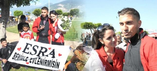 Doğu Akdeniz’in önemli yamaç paraşütü merkezlerin Amanoslar’daki 600 metrelik tepeden eğitmeniyle birlikte tandem (ikili) paraşütle atlayan astsubay Mehmet Öz, süzülerek geldiği sahildeki Atatürk Parkı üzerinde ‘Esra, benimle evler misin’ yazılı pankartı açtı. Parkta paraşütçüleri izleyenler paraşütçünün açtığı pankarta odaklanırken, gözler şanslı genç kızın kim olduğunu aradı.