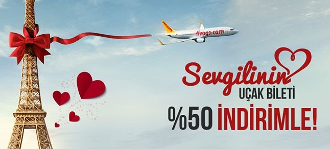 Pegasus Hava Yolları sevdiklerine unutulmayacak bir Sevgililer Günü hediyesi vermek isteyen ve 18 Ocak 2015 tarihine kadar www.flypgs.com’dan biletlerini alan tüm misafirlerini, 9 Şubat-30 Haziran tarihleri arasında yurt dışına 49.99 Euro’dan başlayan fiyatlarla uçuruyor. Üstelik kampanya kapsamında ikinci kişi % 50 indirimli seyahat etme fırsatı buluyor.