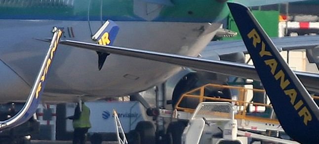 İrlanda’nın Dublin Havalimanı’nda Ryanair’a ait iki yolcu uçağı, piste doğru ilerledikleri sırada çarpıştı. Uçakların ikisinin de kanadı zarar görürken, yolcular korku dolu anların fotoğrafını çekmeyi başardı.