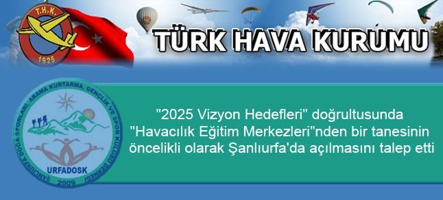 Şanlıurfa Doğa Sporları, Arama Kurtarma, Gençlik ve Spor Kulübü (URFADOSK) Türk Hava Kurumunun "2025 Vizyon Hedefleri" doğrultusunda "Havacılık Eğitim Merkezleri"nden bir tanesinin öncelikli olarak Şanlıurfa’da açılmasını talep etti.