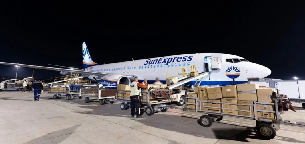 SunExpress öncülüğünde Almanya ile Türkiye arasında kurulan hava köprüsü kapsamında Antalya Havalimanı’na inen kargo uçağı ilk seferde 10 ton yardım malzemesi taşıdı.