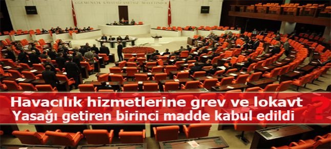 TBMM Genel Kurulunda, Bazı Kanunlarda Değişiklik Yapılmasına Dair Kanun Teklifinin, havacılık hizmetlerinde grev ve lokavt yasağı getiren birinci maddesi kabul edildi.