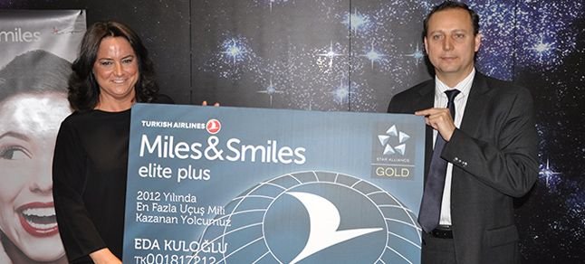 THY 2012 yılında en çok mil kazanan yolcu unvanını elde eden Miles&Smiles Elit Plus üyesi Eda Kuloğlu’na teşekkür plaketi verildi. THY Genel Müdürlük binasında gerçekleştirilen törende konuşan THY Pazarlama ve Satış Genel Müdür Yardımcısı Faruk Çizmecioğlu, 2012 yılında yaklaşık 38 milyon yolcu taşıdıklarını aktardı. 2012 yılında 1.3 milyar TL kar elde ettiklerini aktaran Çizmecioğlu, "Bunu yaparken 2012 yılında 34 yeni dış hat nokta açarak ve ciddi manada büyüyerek yaptık. Bunu başarmamızın arkasında yolcularımızın müşterilerimizin THY’ye gösterdiği ilgi alakadır. Tabi bu ilgi arkasında yolcuya sunduğumuz hizmet ve programlar. Eda Kuloğlu, 2012 yılında THY’yi en fazla kullanan bizim de 100’den fazla dış hat noktaya uçuş gerçekleştirdi. Bu sayede yarım milyona yakın uçuş mili kazandı. Eda Kuloğlu, en çok yolcu mili kazanan yolcu unvanını kazanmıştır." dedi.