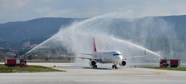 İstanbul Havalimanı’ndan havalanan THY uçağı, Çanakkale Havalimanı’na indi. "Çanakkale" adlı uçak, iniş sırasında oluşturulan su takının altından geçti. Daha sonra yolculara ikramlarda bulunuldu.