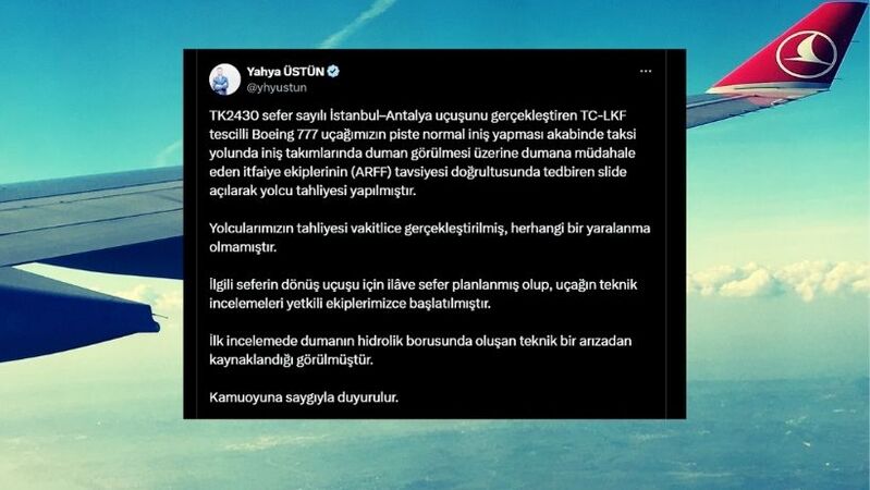 Türk Hava Yolları’nın İstanbul–Antalya seferini gerçekleştiren TK2430 sefer sayılı Boeing 777 tipi yolcu uçağında, Antalya Havalimanı’na inişin ardından iniş takımlarında duman görülmesi üzerine tedbir amaçlı yolcu tahliyesi gerçekleştirildi. Yaşanan olayda herhangi bir yaralanma olmadığı bildirildi.