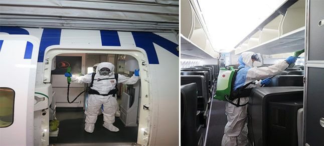 Dezenfeksiyon işlemi ile baş üstü dolapları, pencereler, koltuk başları, koltuk kenarları, mutfak ve lavabolar başta olmak üzere yolcuların ve uçuş ekibinin temas ettiği her nokta derinlemesine temizleniyor. Her uçuştan sonra battaniye ve yastık gibi tekstil ürünleri değiştirilerek yüksek sıcaklıkta yıkama işlemi uygulanıyor.