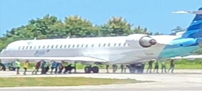 Garuda Endonezya Havayolları’na ait Kupang – Tambolaka seferini yapan yolcu uçağı, havalimanındaki teknisyenler ve uçağın bazı yolcuları tarafından itilerek döndürülmeye çalışıldı.