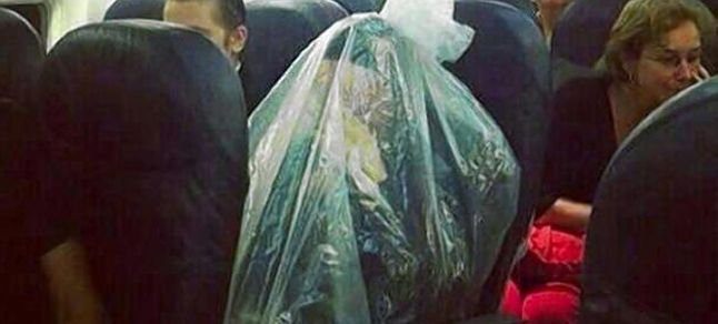 Uçaktaki yolculardan biri tarafından çekilen ilginç karede giyinişinden Yahudi olduğu anlaşılan bir şahıs, üzerinde en ufak bir delik olmayan poşetin içinde görülüyor.