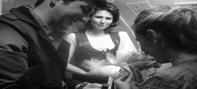 Kalkıştan hemen sonra yüzük ve çiçek buketini alan genç adam, sevgilisine şaşkın bakışlar arasında evlenme teklifinde bulundu. Olayın heyecanını ve şaşkınlığını gizleyemeyen genç kadın, ilk şoku üzerinden attıktan sonra teklife ‘Evet’ cevabını verdi. Yolcular ise genç çifti alkışlayarak mutluluklarına ortak oldular.