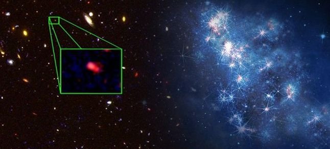 Galaksiden yayılan ışık, 13,1 milyar yıl sonra Dünya’ya ulaştı ve Hubble Uzay Teleskopu ile Hawaii’deki Keck Gözlemevi’nin kızılötesi kameraları tarafından tespit edildi.